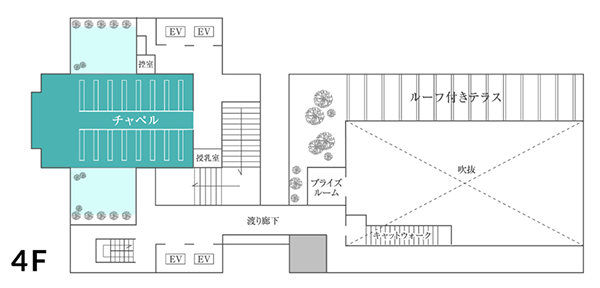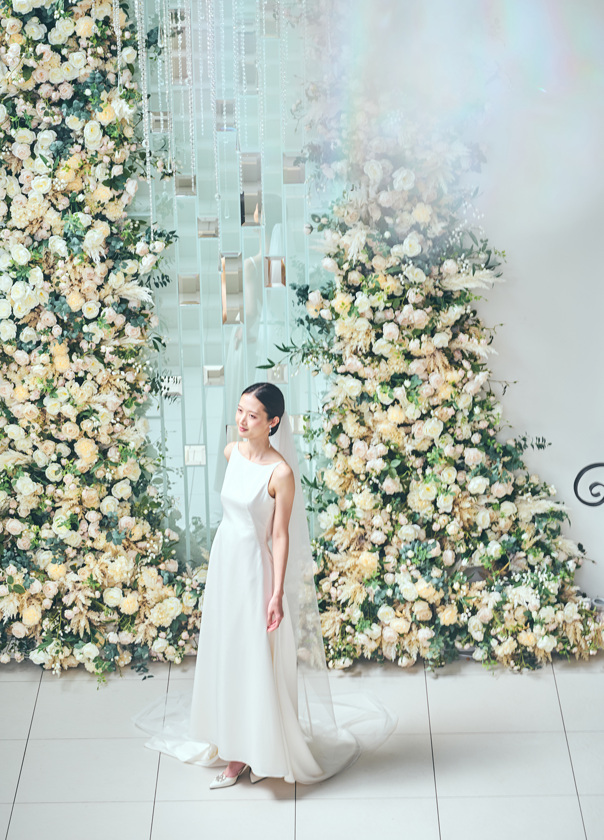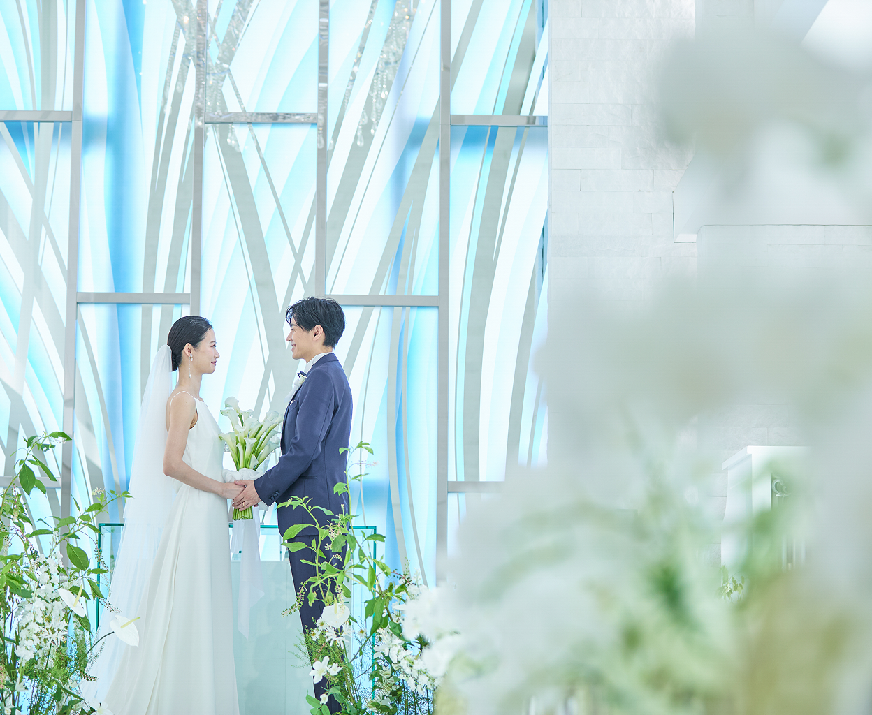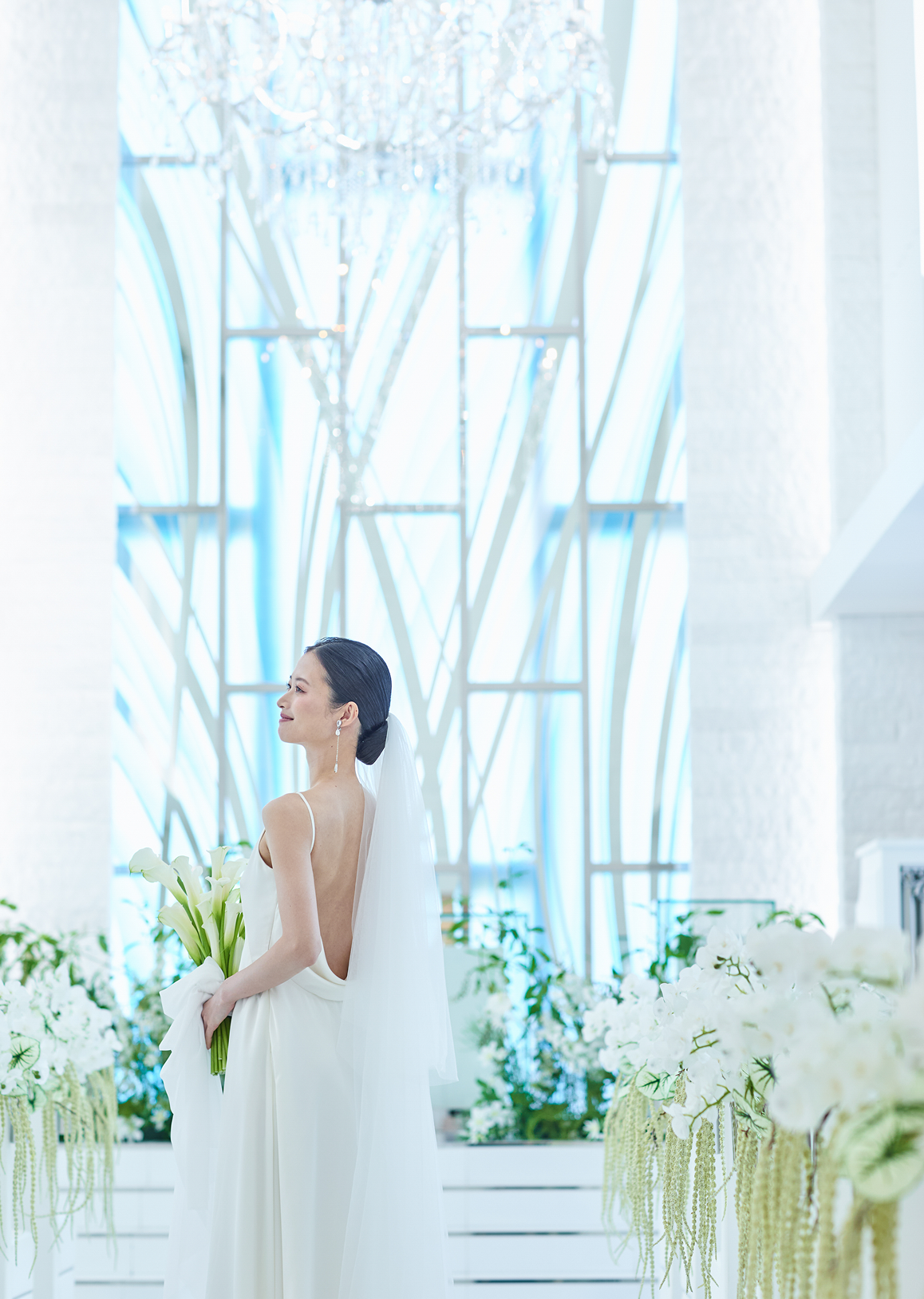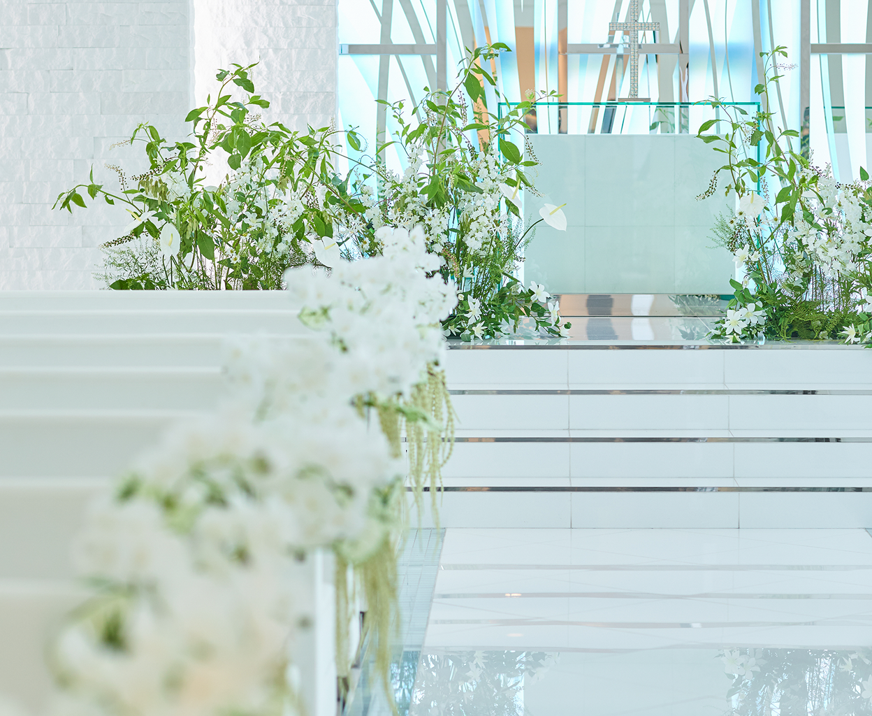 水と緑 そして光に包まれた純白のチャペル 両サイドに広がる水庭と天窓からの自然光が 祭壇をやさしく照らし 花嫁の姿をより一層美しく引き立てます
