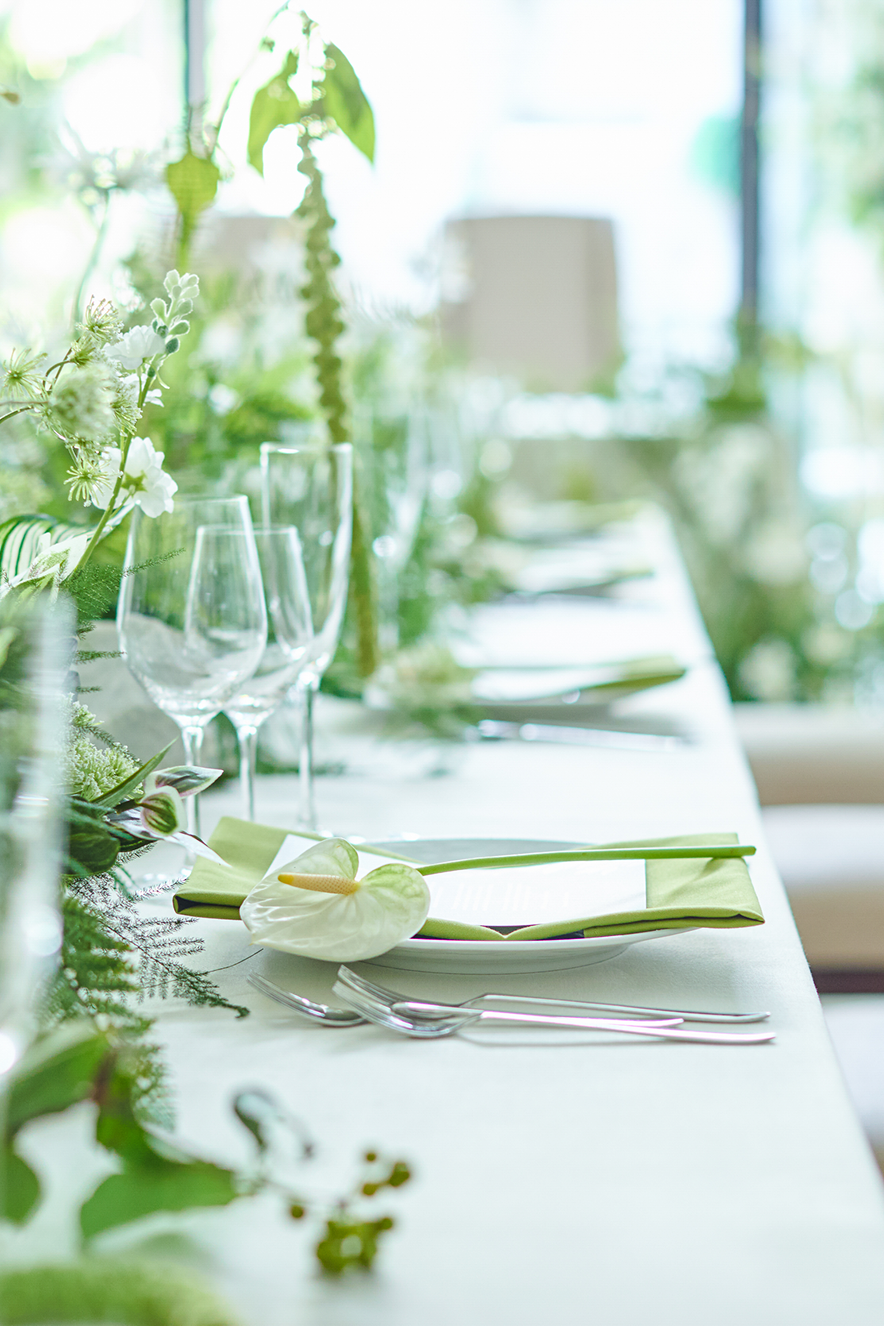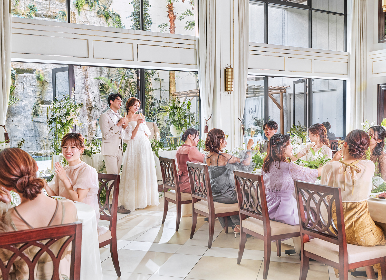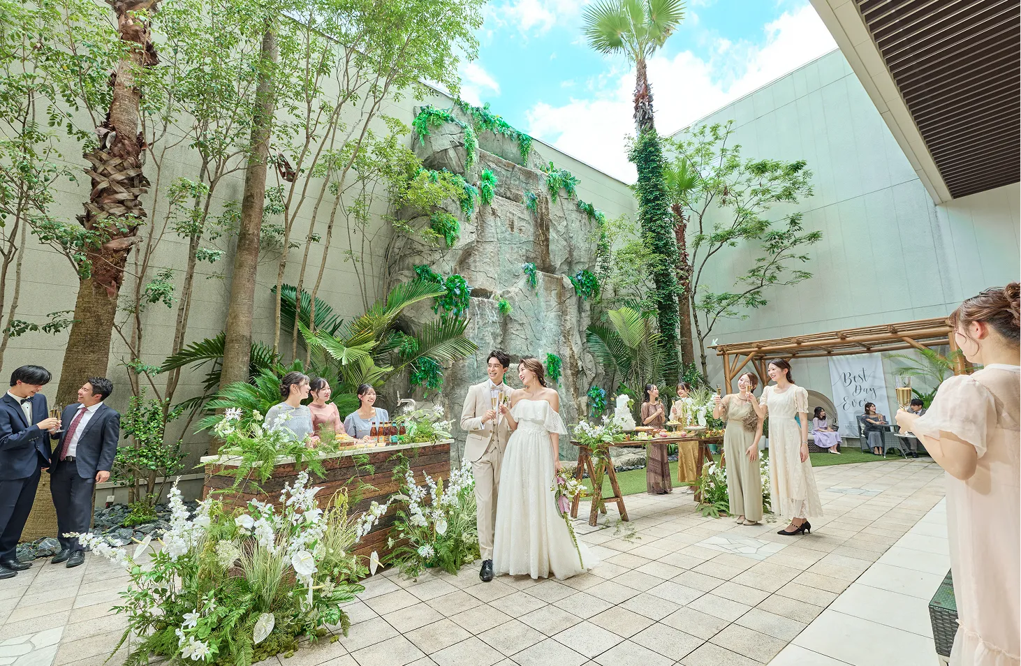 緑と光があふれる中でのパーティは まるでリゾートに招かれたような心地よさ ゲストと笑顔がこぼれる 穏やかな祝宴のひとときを叶えます