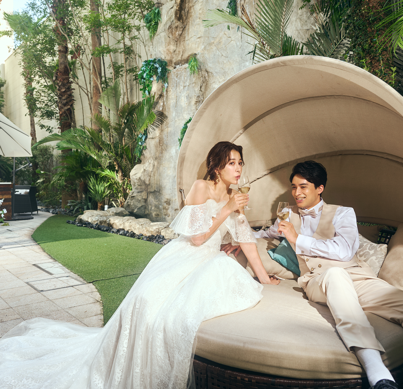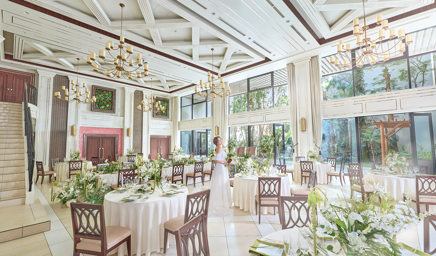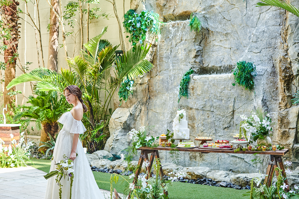 緑と光があふれる中でのパーティは まるでリゾートに招かれたような心地よさ ゲストと笑顔がこぼれる 穏やかな祝宴のひとときを叶えます